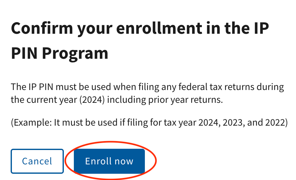 Scroll to the bottom of the profile page and click the “Enroll in IP PIN” button: